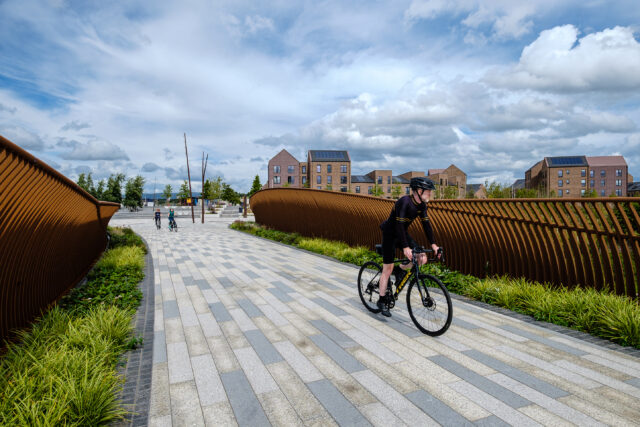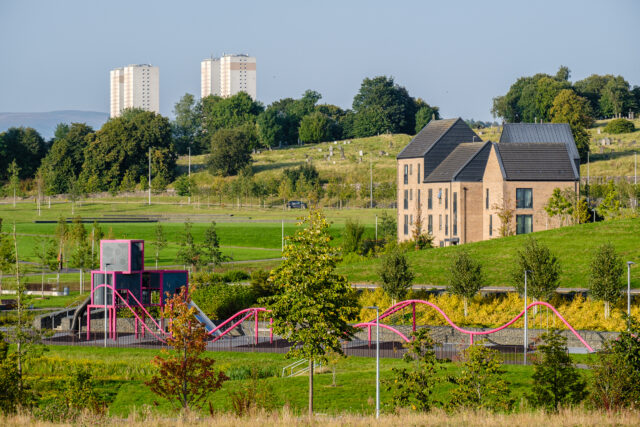 The regenerated neighbourhood is now just a ten-minute walk from Glasgow’s centre over a new car-free, accessible bridge across the motorway, encouraging active travel and plugging the area into the city and its opportunities.