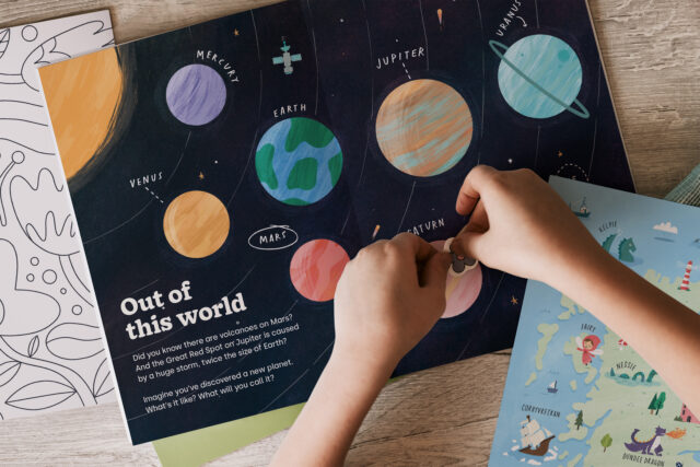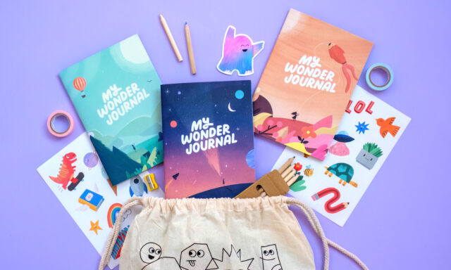 Every element of Wonderbox is an opportunity to play, starting with the packaging. The cotton drawstring bag comes with fabric pens for kids to personalise them, and stickers of skateboarding dinosaurs, dancing blueberries and flying books to decorate their journals with. The activities inside are designed to appeal to kids’ natural inquisitiveness and give them the freedom to approach learning in a way that works for them.
